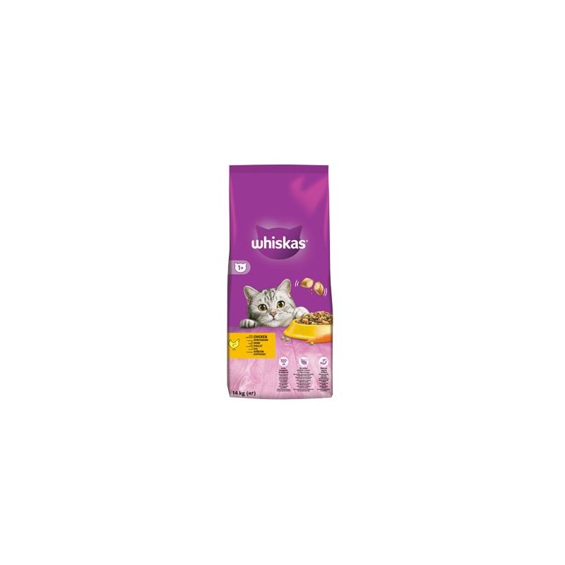 Whiskas Dry s kuřecím masem a játry 14kg - mujmazel.cz - Kompletní suché krmivo pro dospělé kočky s kuřecím masem a játry. Podporuje perfektní zrak, lesklou srst, zdravé srdce a močové ústrojí. Tvar granulek dále napomáhá ke správné dentální hygieně.