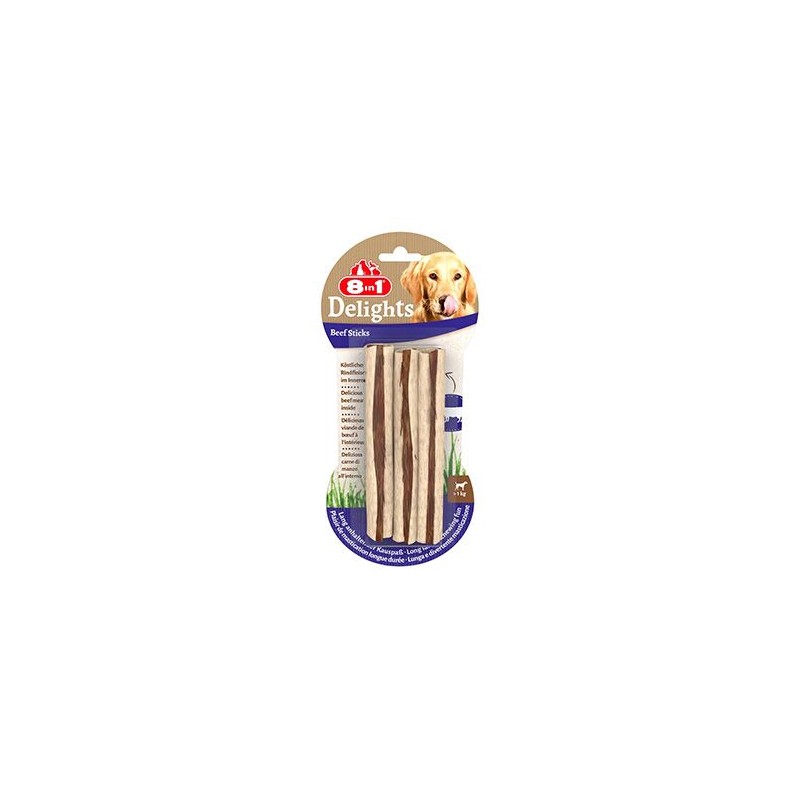 Tyčinka žvýkací Delights Beef 3ks - mujmazel.cz - Žvýkací tyčinky Delight 8in1 jsou určeny pro psy od 1 roku. Díky kombinaci surové kůže a chutného masa uprostřed uspokojí přirozený instinkt psa žvýkat a zároveň procvičují čelistní svalstvo.