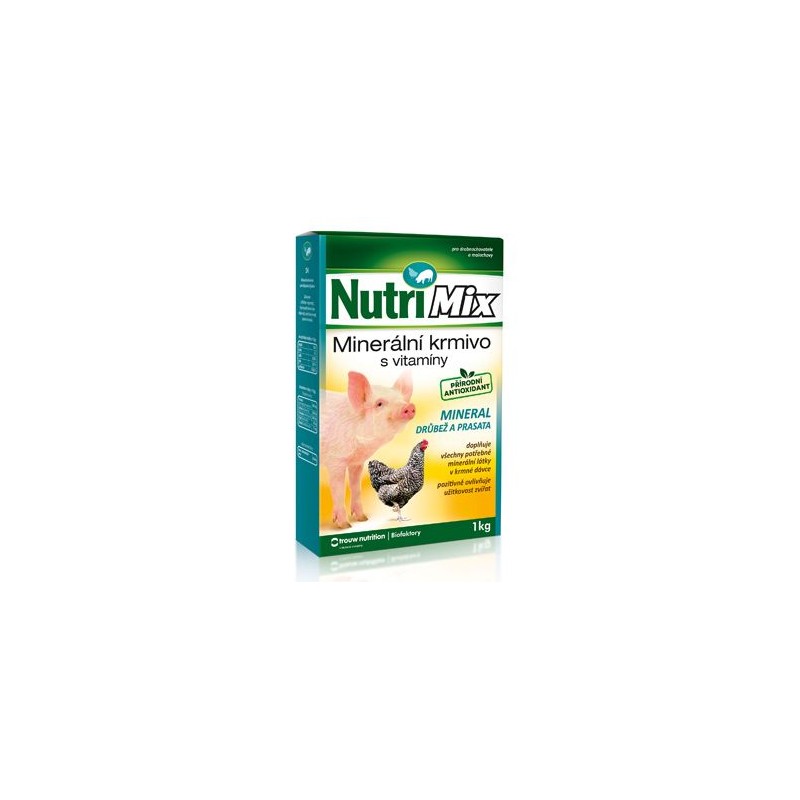 Minerální krmivo pro prasata a drůbež. NUTRI MIX MINERAL je určen pro drobnochovatele a malochovy. Přidává se do krmné dávky drůbeže a prasat k pravidelnému doplnění a vyvážení tradiční krmné dávky. Obsahuje biologicky účinné látky – makro a mikroprvky. Tato směs umožňuje chovatelům dokompletovat neplnohodnotnou krmnou dávku na potřebnou úroveň a udržovat tak dobrý zdravotní stav zvířat, případně řešit nedostatek minerálních látek při poruchách minerálního metabolismu (rachitidě, osteomalácii apod.). Zajišťuje úspěšný chov, odchov a výkrm všech kategorií drůbeže a prasat.