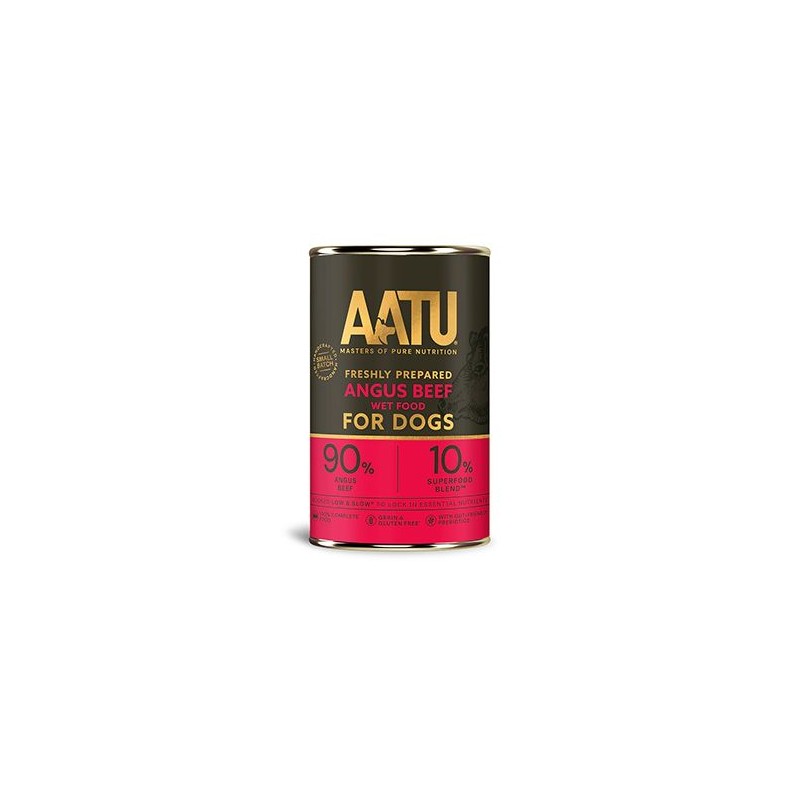 AATU Dog Angus Beef konz. 400g - mujmazel.cz - Kompletní superprémiové vlhké krmivo bez obilovin pro dospělé psy, obsahující 90 % hovězího masa. Super 8: 8 druhů zeleniny, 8 druhů bylinek, 8 druhů koření.