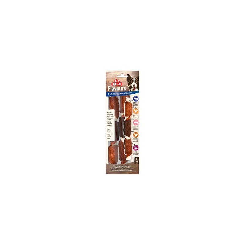 Pochoutka 8in1 Triple Flavour Mega Skewers 160g - mujmazel.cz - Lahodné pamlsky 8in1 Triple Flavour Mega Skewers jsou větší variantou oblíbených Triple Flavour Skewers a jsou ideální pro delší zabavení větších psů. Žvýkací střed z vepřové a hovězí kůže je obalený chutnými kuřecími prsíčky, kachními prsíčky a kuřecími játry a vytváří tak lahodnou pochoutku pro psy.