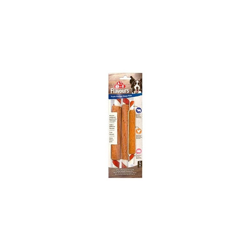 Pochoutka 8in1 Triple Flavour Mega Ribs 140g - mujmazel.cz - Lahodné pamlsky 8in1 Triple Flavour Mega Ribs jsou větší variantou oblíbených pamlsků Triple Flavour Ribs a jsou ideální pro větší psy na delší žvýkání. Žvýkací část z vepřové a hovězí kůže je obalená chutnými kuřecími prsíčky a vytváří tak lahodnou pochoutku pro psy.