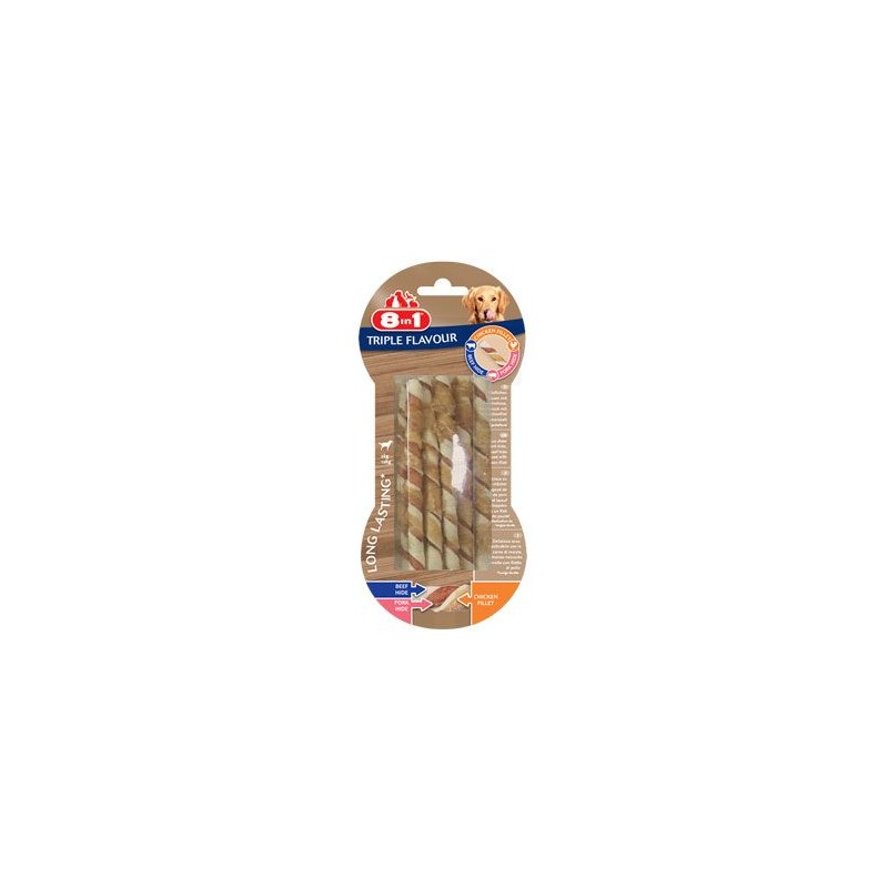 8in1 Triple Flavour lahodné žvýkací kroucené tyčinky jsou vyrobené z vepřové a hovězí kůže obalené kuřecím masem - pro dlouhotrvající zábavu vašeho psa. Dlouhotrvající zábava ze žvýkání redukuje plak a předchází tvorbě zubního kamene.