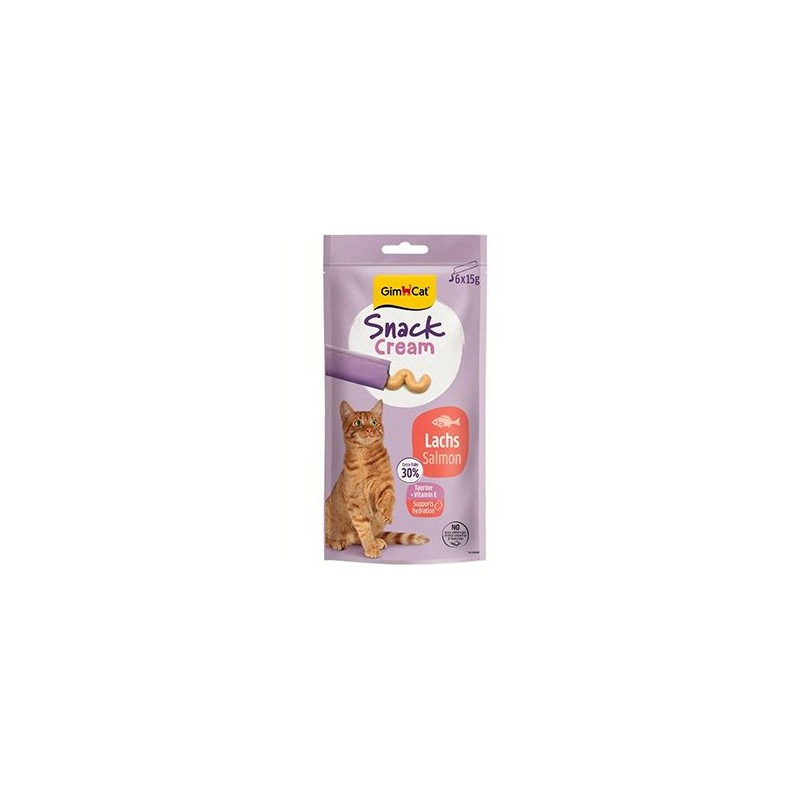 GimCat Snack Cream losos 6x15g - mujmazel.cz - Doplňkové krmivo pro kočky, příjemná krémová pochoutka s vysokým obsahem lososího masa, balená v sáčcích po jednotlivých porcích.