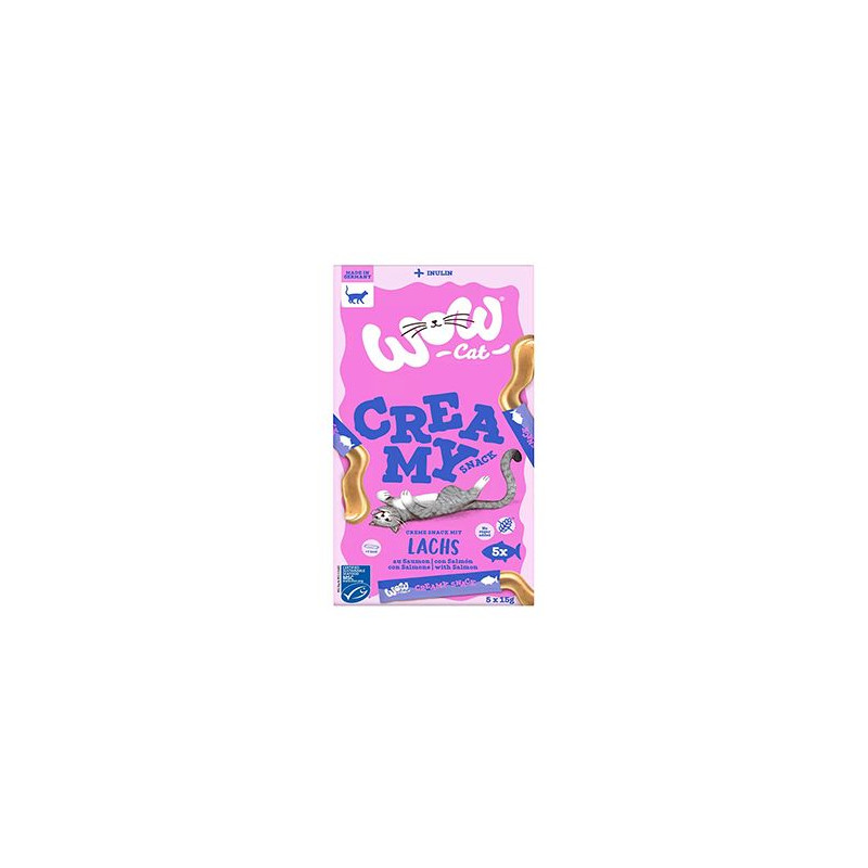 WOW Cat poch. Creamy Snack s lososem 5x15g - mujmazel.cz - Doplňkové krmivo pro dospělé kočky, krémová svačinka s jemnými kousky lososa je díky praktickému podlouhlému sáčku ideální jako lízací pamlsek.