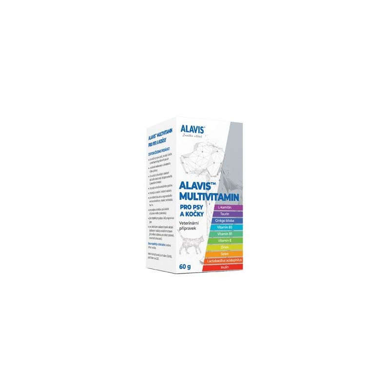 ALAVIS™ Multivitamin pro psy a kočky napomáhá ke zmírnění projevů stáří, pro lepší vitalitu a předcházení kognitivních poruch. Vhodný je také jako doplněk pro podporu léčby regenerace jater nebo pro předcházení poškození buněk volnými kyslíkovými radikály a oxidačním stresem (při zánětech, diabetes, poruchách plodnosti, poruchách zraku apod.).