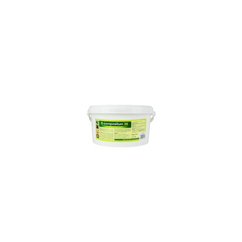 C-Compositum 25procent je kompletní krmná přísada biologicky účinných látek. Pomáhá ke zvýšení obranyschopnosti organismu vůči infekčním onemocněním, zejména u mláďat všech druhů zvířat. Při mimořádném zatížení v důsledku transportního a tepelného stresu a při všech stavech vyčerpanosti organismu. Při dermatózách, anémiích, krvácení, při poruchách reprodukce a pro podporu hojení ran a zlomenin. U drůbeže k příznivému ovlivnění snášky a kvality skořápky, pro optimální vývoj embryí kuřat a jejich správný vývoj v preinkubačním období. C-